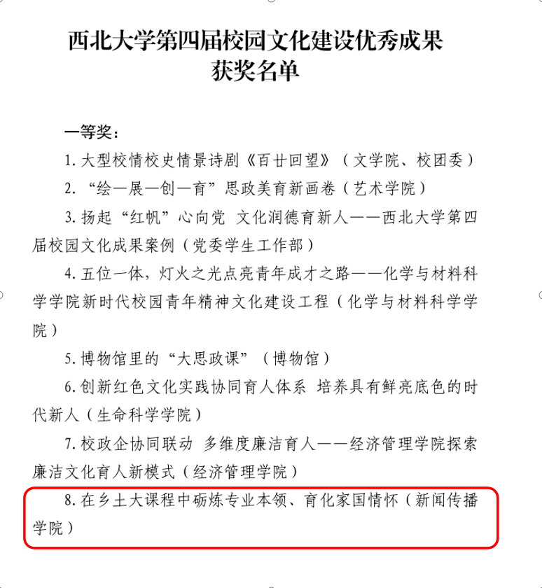 近日,在学校第四届校园文化建设优秀成果评选中,由我院赵爽英副教授组织申报的《在乡土大课程中砺炼专业本领、育化家国情怀》喜获一等奖。