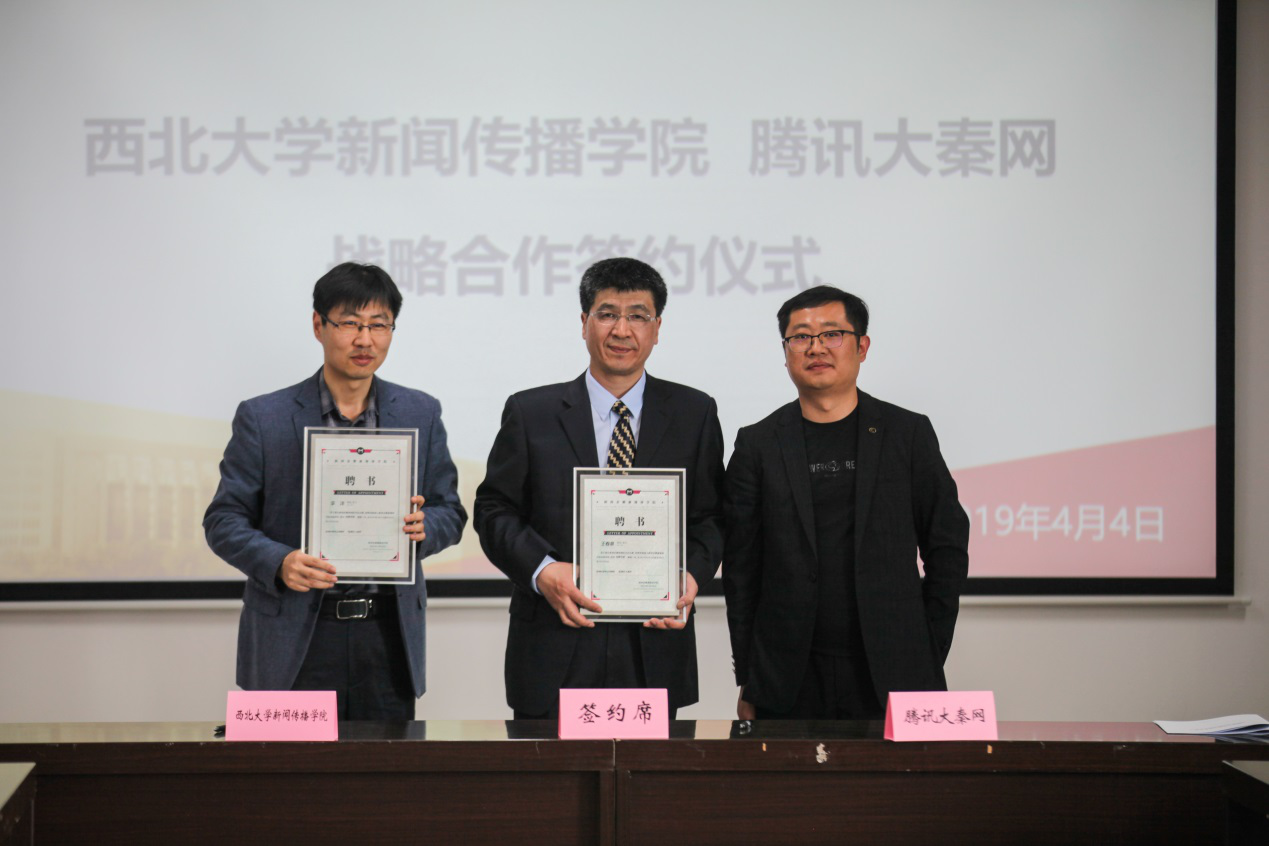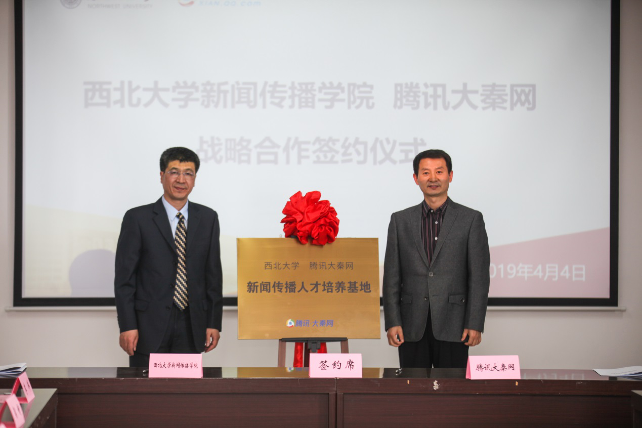 4月4日,我院与腾讯大秦网在长安校区举行了战略合作签约仪式,成立了西北大学腾讯大秦网实习基地。腾讯大秦网总裁、我校96级校友贺柯,总编辑孙洪伟,区域拓展总监李梦颖,秘书长龚继武,我校宣传部、教务处、我院相关负责人以及师生代表参加了本次会议。
