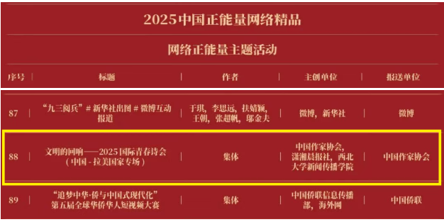 3月29日,由中央网信办主办的2025中国正能量网络精品征集展播活动正式揭晓获奖结果,由中国作家协会、潇湘晨报社与西北大学新闻传播学院联合申报的《文明的回响——2025国际青春诗会(中国—拉美国家专场)》成功获评“网络正能量主题活动”。这不仅是对此次文化传播活动的高度认可,更是我院立足新闻传播学科特色、践行全球文明倡议、服务国家对外传播战略的生动实践。