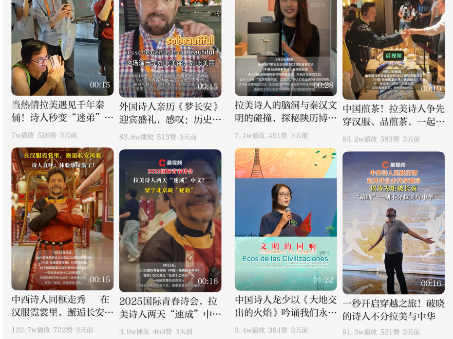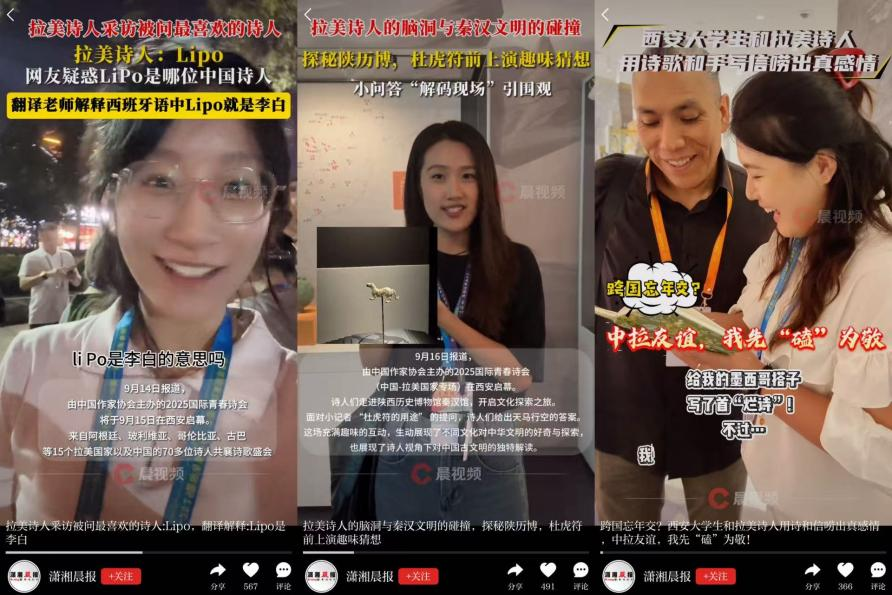 活动期间,随团报道的六位同学在专业媒体人的指导下,以青春视角敏锐捕捉活动现场的生动细节,展现出诗人们体验中国传统文化、感受美食美景、以及彼此互动的精彩瞬间,连续推出了“拉美诗人的‘速成’中文”“中拉翻译官联手‘搭桥’”“墨西哥诗人cos乐舞佣”“杜虎符前的趣味猜想”“拉美诗人为秦兵马俑即兴作诗”“可爱李白《将进酒》圈粉拉美诗人”“大学生与拉美诗人的跨国忘年交”等数十个有故事、有温度又有流量的短视频作品,极大提升了此次诗会的网络热度与传播声量。