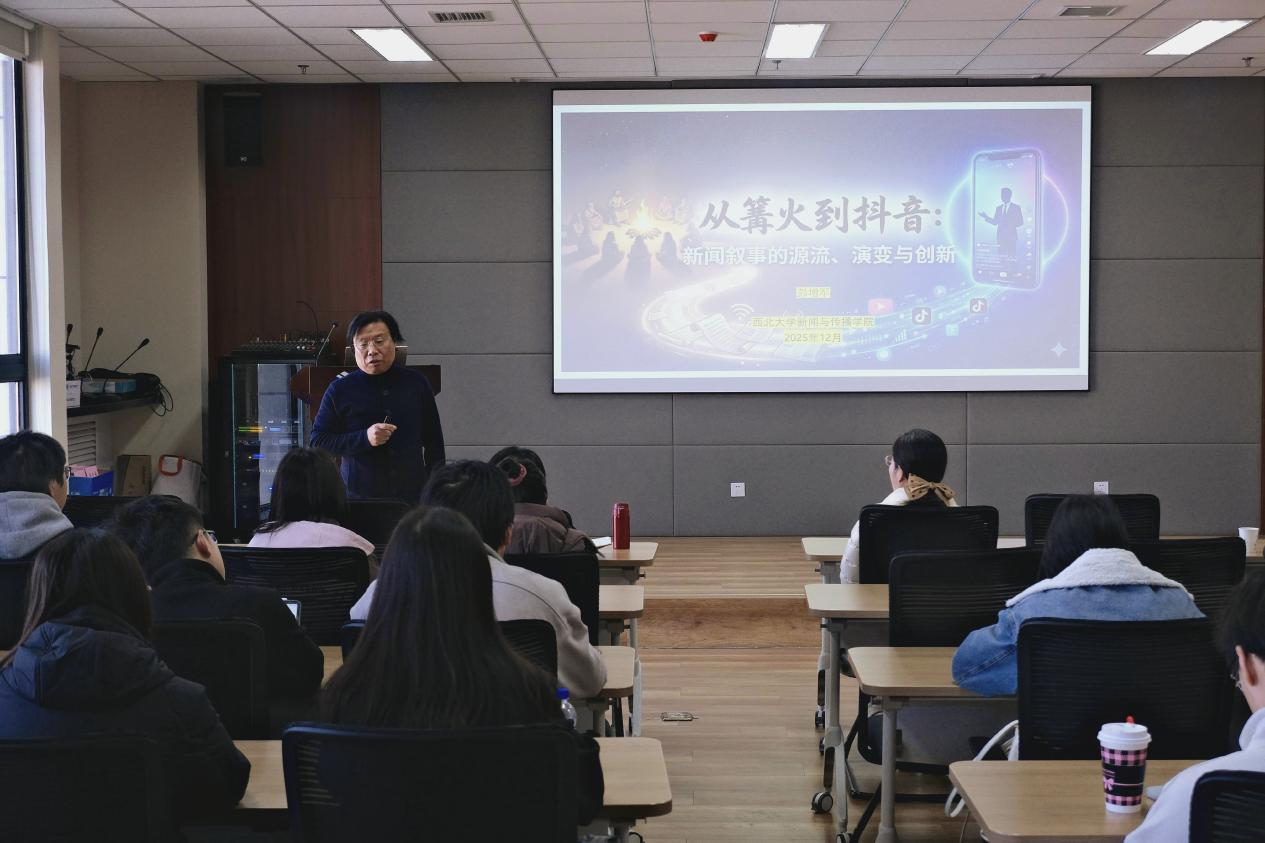 2025年12月25日上午10:10,美国圣克劳德州立大学(St.Cloud State University)大众传播与电影系教授、国际华莱坞电影学会(World Huallywood Academy)理事长彭增军应邀做客西北大学新闻传播学院,为师生作题为“回到未来:新闻叙事范式的源流、演变与创新”的学术讲座。讲座在东学楼9层北0901举行,由西北大学新闻传播学院李玮教授主持,学院师生到场聆听并参与交流。