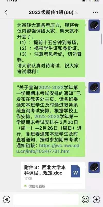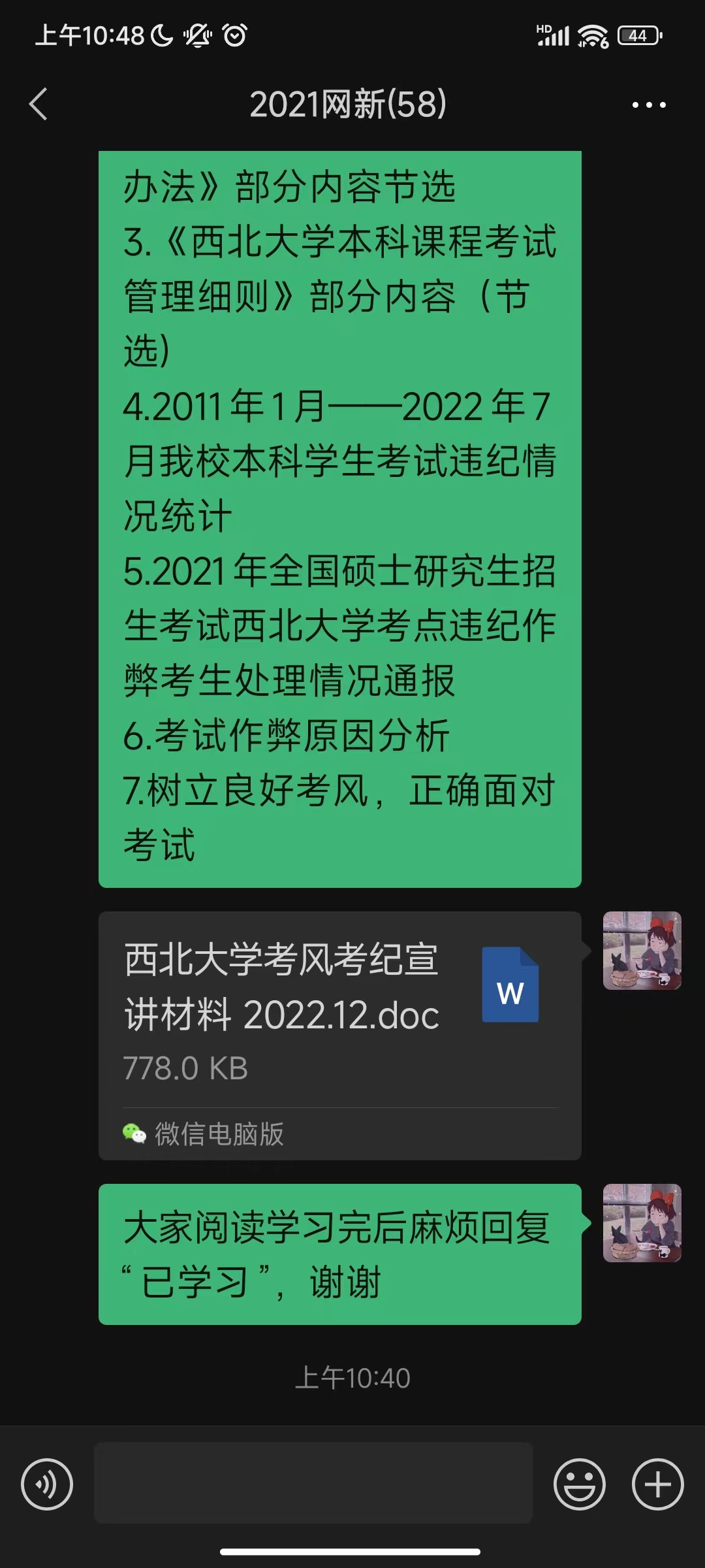 冬去春来,又是一年的开学季,与开学一同到来的还有推迟的期末考试。为了进一步严肃考纪考风,打造公平公正的考试环境,营造良好的学风考风,西北大学新闻传播学院于线上开展多种形式的考风考纪宣传教育活动。各班以班会、微信群交流等形式对考风考纪内容进行学习交流,各班班干部对相关法律规定、学生违纪情况、违纪原因、应对措施等内容进行了宣传讲解,同学们认真学习、积极交流,营造出“遵纪光荣,违纪可耻”的良好氛围。