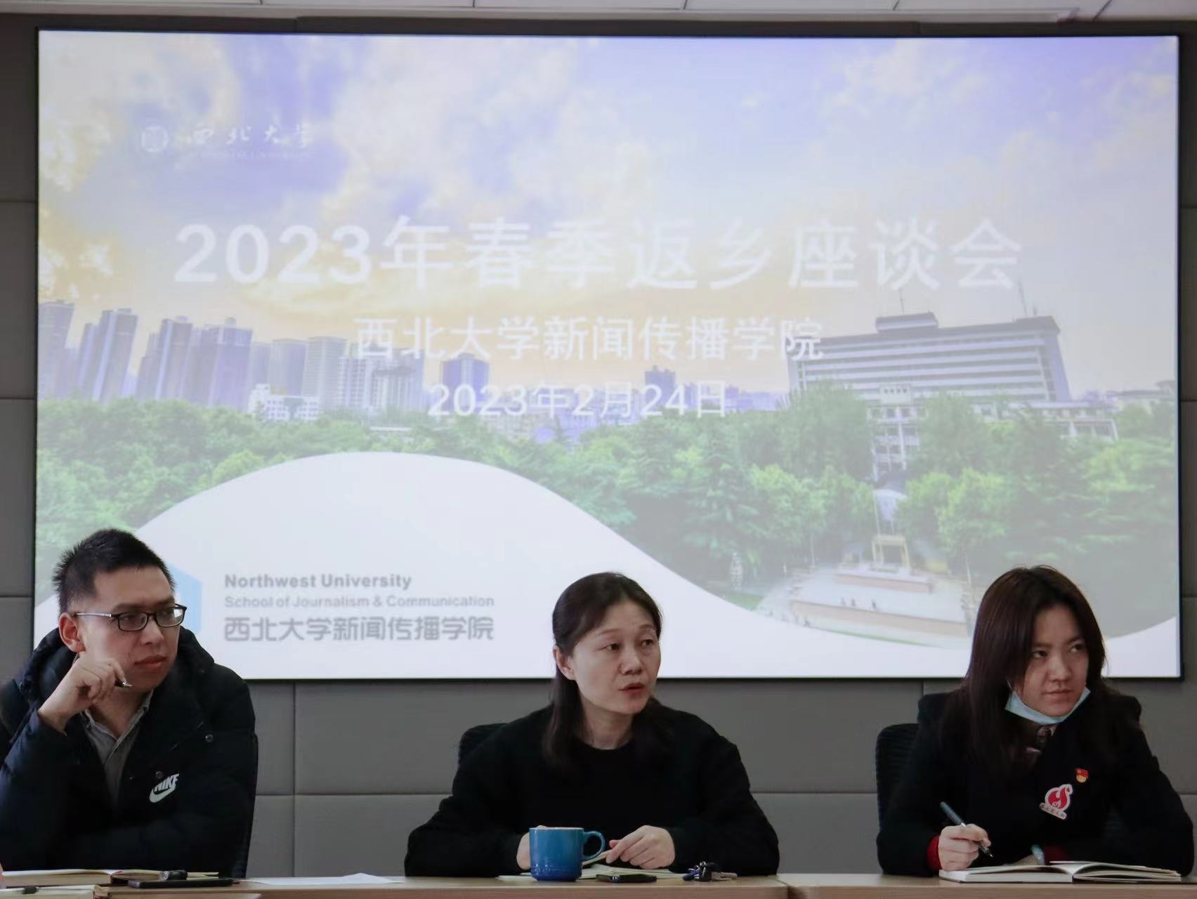2023年2月24日下午,西北大学新闻传播学院组织召开2023年春季学生返乡座谈会。学院党委副书记梁婕老师、党委组织员赵钧陶老师、21级辅导员魏怡孜老师、22级辅导员王恒老师以及来自学院各年级各专业本科生、研究生代表参加了此次座谈会。