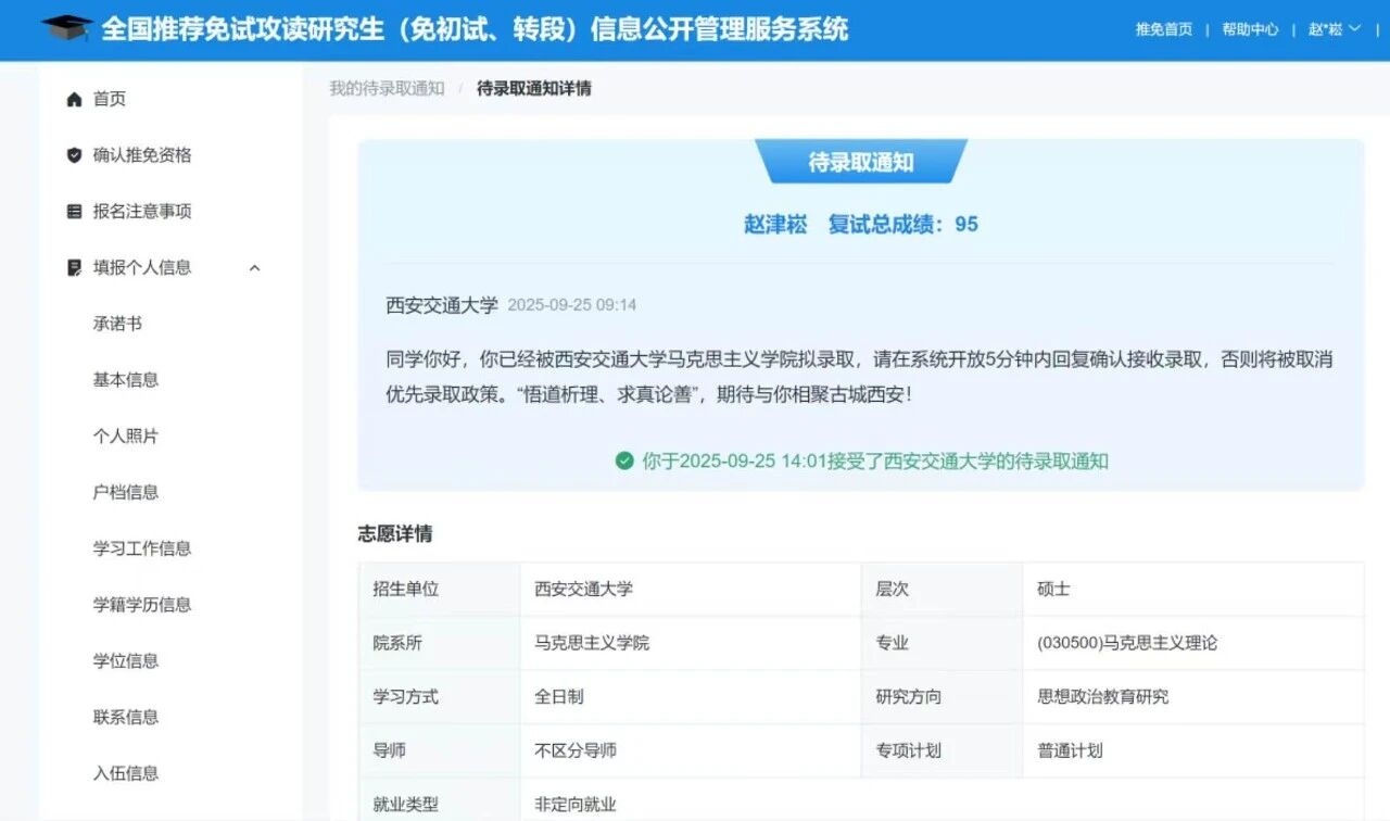 春种一粒粟,秋收万颗子。多年的耕耘终于换来了收获,赵津崧成功保研至了西安交通大学马克思主义学院。“我相信大家时常会有迷茫、沮丧和对未来的不确定性,不知道自己未来会干 什么,能干什么,能干好什么。我觉得这都非常正常,我认为与其焦虑未来,不如做好当下。一步一个脚印,做好自己该做的事情,为学校、为学院争光,对得起每一位老师为我们的付出。”