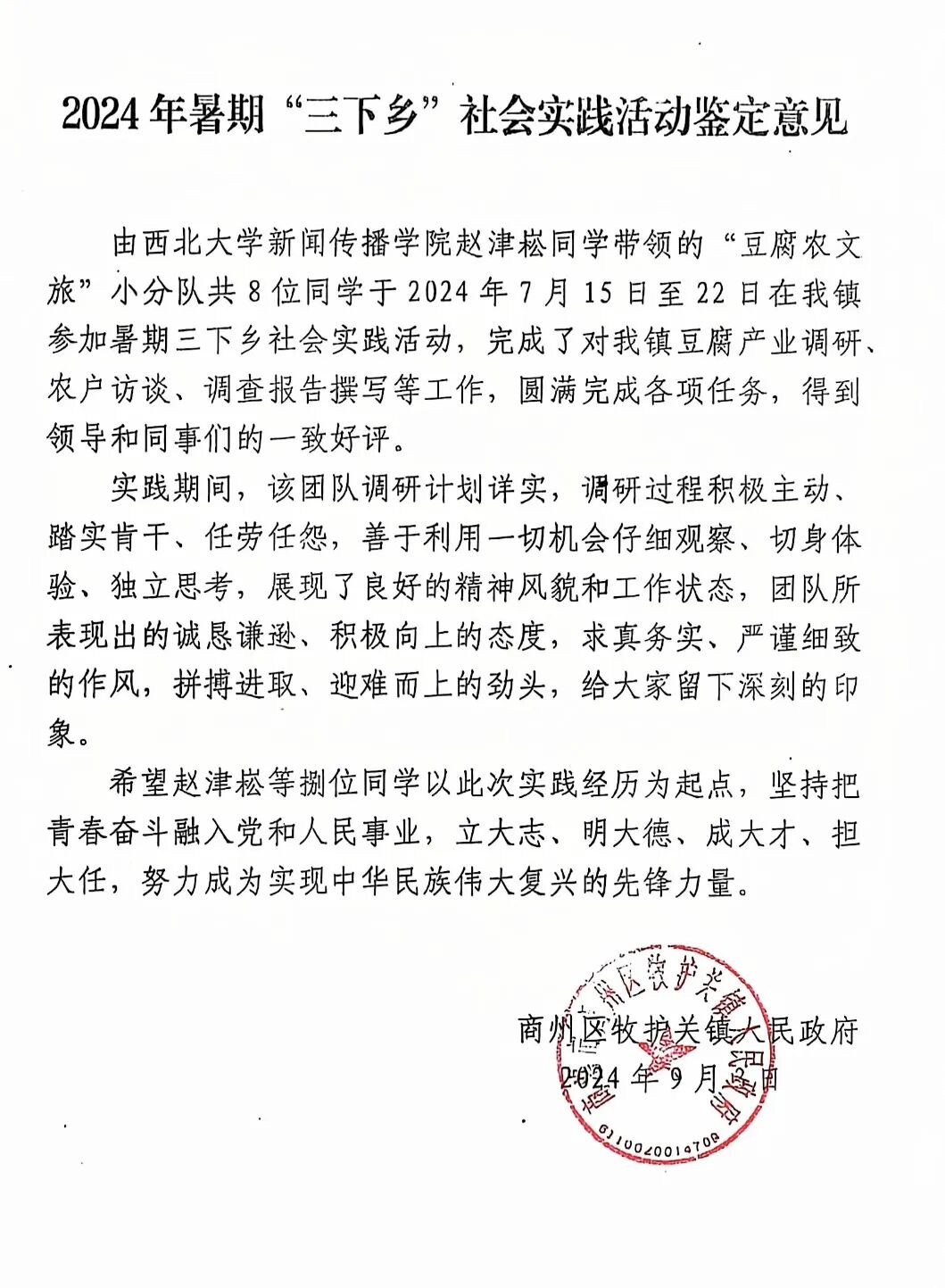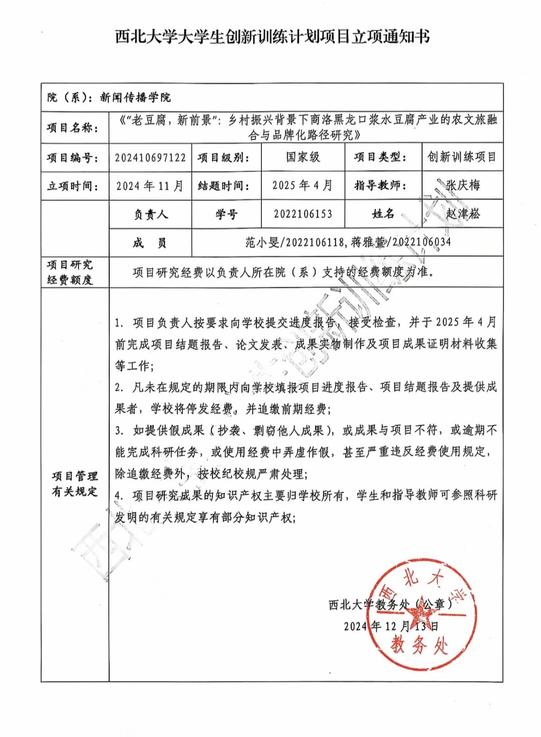 作为《“老豆腐,新前景”:乡村振兴背景下商洛黑龙口浆水豆腐产业的农文旅融合与品牌化路径研究》国家级大学生创新创业训练项目的项目负责人,他负责设计调查问卷,带队调研收获200份有效问卷,写2万字社会调研报告和2篇新闻报道,并以通讯作者发表学术论文一篇。该项目以商洛黑龙口豆腐制作技艺为核心,深挖豆腐文化内涵,构建了农文旅一体化发展框架,最终实现牧护关镇产业新发展。项目得到政府认可,成功构建农文旅发展新模式。